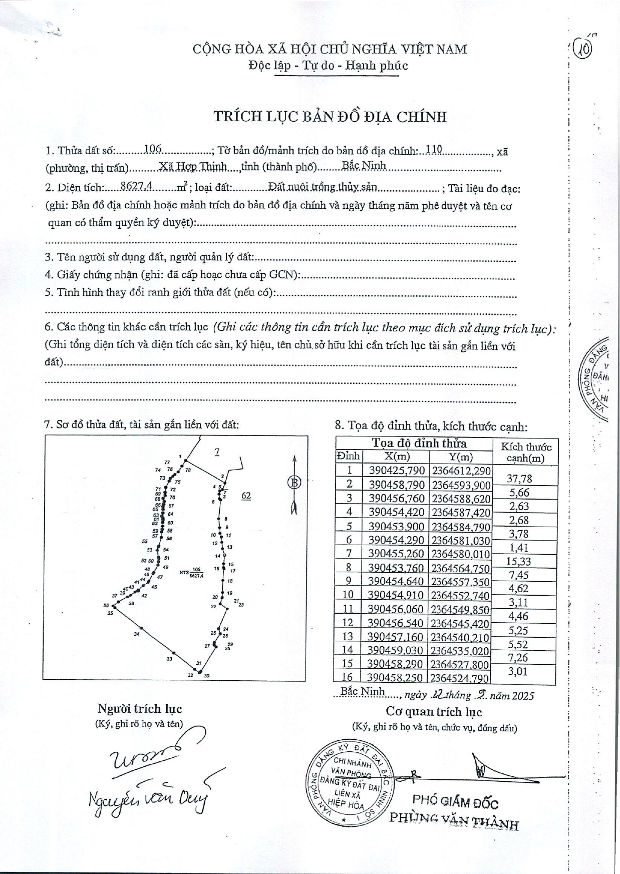 2. Tài sản đấu giá: Đấu giá cho thuê Quyền sử dụng thửa đất số 106 thuộc tờ bản đồ số 110, thôn Giang Tân, xã Hợp Thịnh, tỉnh Bắc Ninh.